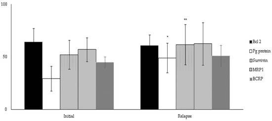 Figure 6. Comparison of expression (%) of Bcl-2, P-gp/ABCB1, MRP1/ABCC1, BRCP/ABCG2, and survivin in paired samples in Relapsed DLBCL at initial diagnosis and relapse. * p < 0.05, ** p < 0.01 vs. initial diagnosis). Abbreviations: DLBCL—diffuse large B-cell lymphoma.