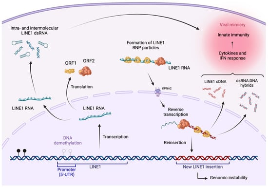 The LINE1 lifecycle. LINE1 retrotransposition is a highly regulated, multi-step process that allows for the mobility and insertion of long interspersed nuclear elements in the genome. Following demethylation, LINE1 elements transcription is driven by a promoter located in their 5′ untranslated region (5′-UTR). Upon modifications stabilizing the LINE1 transcripts, LINE1 open reading frames are translated in the cytoplasm. LINE1 open reading frames encode two distinct proteins: ORF2, which possesses endonuclease and reverse transcriptase activities, and ORF1, which functions as a nucleic acid chaperone responsible for ribonucleoprotein particle (RNP) assembly. Both proteins are critical for the association of LINE1 RNA and the formation of a LINE1-RNP intermediate complex. This complex is imported into the nucleus either passively during cell division or actively through interactions with nucleoporin proteins (e.g., KPNA2). Here, the reverse transcriptase and endonuclease activities of ORF2 synthesize a complementary DNA strand and integrate it into a new genomic location. LINE1-derived double-stranded RNA (dsRNA) generated by inter or intramolecular complementarity, cDNA, and LINE1 RNA:DNA hybrids in the cytoplasm can trigger an antiviral-like innate immune response. Due to truncations, internal rearrangements, and mutations frequently occurring through the lifecycle, most newly integrated LINE1 copies are not competent for further retrotransposition. Created with BioRender.com (accessed on 10 August 2023).