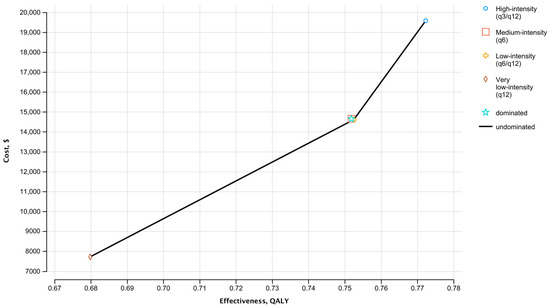 Base case cost-effectiveness frontier comparing four active surveillance strategies with varying intensity of follow-up. QALY, quality-adjusted life year.