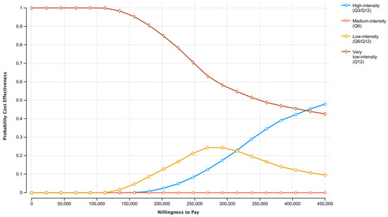 Comparing the active surveillance strategies at willingness-to-pay thresholds of CAD 50,000–100,000 per QALY, the q12 strategy had the highest probability of being most the cost-effective (Figure 3). However, at willingness-to-pay thresholds greater than approximately CAD 425,000 per QALY, the q3/q12 strategy had the highest probability of being cost-effective compared to the other surveillance schemes. The q6 surveillance strategy was the least likely to be cost-effective at any willingness-to-pay threshold.