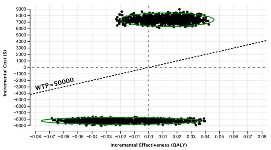 Incremental cost-effectiveness plane obtained through probabilistic sensitivity analysis with 10,000 model simulations for each comparison. Upper cluster, q12 surveillance strategy vs. q6/q12 strategy; lower cluster, q3/q12 strategy vs. q6/q12 strategy. QALY, quality-adjusted life year; WTP, willingness-to-pay.