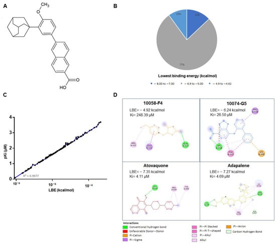 Molecular docking of candidate c-MYC inhibitors. (A) Chemical structure of adapalene. (B) Pie chart showing the percentage of FDA-approved ligands belonging to a particular lowest binding energy (kcal/mol) range. (C) Correlation coefficient representation of predicted inhibition constant (pKi) vs. lowest binding energies (LBE). (D) 2D representations of the various interactions between the amino acid residues of c-MYC and the corresponding compounds (10058-F4, 10074-G5, atovaquone, and adapalene) were generated using Discovery Studio Visualizer software (version v.21.1.0.20298). The lowest binding energies (LBE) and the predicted inhibition constant (Ki) of each compound were acquired from AutoDockTools 4.2.6.