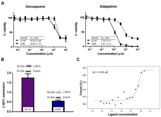 Specificity of atovaquone and adapalene towards c-MYC. (A) Assessment of c-MYC protein expression in HL60 and U266 cells by western blot. c-MYC protein expression was three times higher in HL-60 than in U266 cells. The bar diagram was obtained by calculating the mean value ± SD of three independent experiments. (B) The cytotoxic effect of atovaquone and adapalene in HL-60 and U266 cells. HL60 cells were more susceptible to adapalene and atovaquone than U266 cells. HL60 cells displayed a greater sensitivity to adapalene than to atovaquone. Adapalene showed higher specificity to c-MYC. (C) Binding of adapalene to recombinant human c-MYC as measured by microscale thermophoresis (MST). The fluorescence signal changed depending on the concentration as shown by the binding curve. The law of mass action was used to obtain fitness. MST was conducted with 70% LED power and 10% MST power.