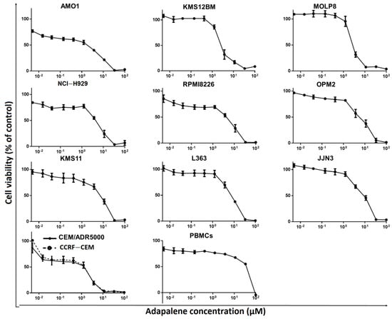 Adapalene’s cytotoxic effect in various human MM cell lines (AMO1, KMS12BM, MolP8, NCI-H929, RPMI8226, OPM2, KMS11, L363, and JJN3), in human T-ALL cells (CEM/ADR5000 and CCRF/CEM), and in peripheral blood mononuclear cells (PBMCs). Each value indicates the mean value ± SD of three distinct experiments, each of which had six replicates.