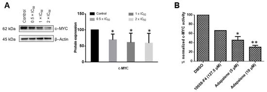 Adapalene affected c-MYC expression and transcriptional activity. (A) Effect of adapalene (0.5 × IC50, 1 × IC50, and 2 × IC50) on c-MYC protein expression in AMO1 cells as displayed by western blot. The bar diagram was created by calculating the mean value ± SD of three independent experiments. The uncropped bolts are shown in Supplementary Materials Figure S2. (B) Effect of adapalene and 10058-F4, a known c-MYC inhibitor, on c-MYC transcriptional activity. The bar diagram represents the percentage of normalized c-MYC activity in HEK293 cells transiently expressing a c-MYC-luciferase reporter construct. It was created by calculating the mean value ± SD of two independent experiments. * p < 0.05, ** p < 0.01, if compared to negative control.