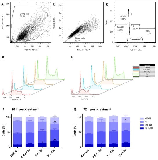 Cell cycle perturbations of AMO1 cells by adapalene. (A–C) Gating scheme: (A) The first gate (SSC-A vs. FSC-A) intends to get rid of the debris. (B) The second gate (FSC-H vs. FSC-A) aims to select only single cells. (C) Count vs. FL2-A represents cell cycle histograms. (D,E) DNA histograms of AMO1 exposed to adapalene (0.5 × IC50, 1 × IC50, and 2 × IC50) for 48 h (D) and 72 h (E). The histograms were obtained by flow cytometry using an excitation and an emission wavelength of 488 and 530 nm, respectively. (F,G) The bar diagrams showing the distribution of AMO1 cells treated with adapalene in the distinct phases of the cell cycle after 48 h (F) and 72 h (G) were created by calculating the mean value ± SD of two independent experiments. * p < 0.05, ** p < 0.01 if compared to negative control.