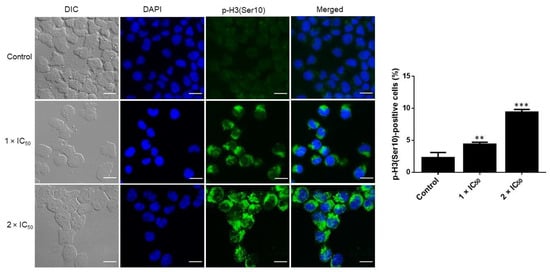 Phospho-histone-3 (Ser10) (p-H3(Ser10)) represents a cell cycle marker to assess cells in the late G2/M phase [42]. To confirm whether adapalene induced G2 or M arrest, we examined the effect of adapalene on the expression of p-H3(Ser10), a mitotic hallmark that is crucial in regulating the mitotic catastrophe [43]. Adapalene significantly increased the expression of p-H3(Ser10) in AMO1 cells after treatment for 48 h (Figure 7). Therefore, adapalene indeed induced the accumulation of AMO1 cells in the M-phase.
