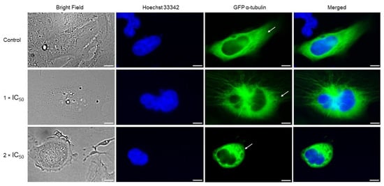 Mitotic arrest is most likely caused by the suppression of microtubule polymerization because microtubules are essential for chromosomal separation during mitosis [44]. Considering that adapalene led to G2/M arrest, we examined its impact on the tubulin network. U2OS cells stably transfected with α-tubulin-GFP fusion construct were treated with adapalene (1 × IC50 and 2 × IC50) for 48 h, and the tubulin network was visualized by confocal microscopy. Control cells perfectly polymerized the tubulin network. This was demonstrated by the significant amount of tubulin that disseminated throughout the cytoplasm and produced a strong intracellular network. By contrast, the tubulin network appeared in a chaotic shape upon adapalene treatment. Adapalene expanded the tubulin mass surrounding the nucleus while decreasing the growth of microtubules at the borders. Additionally, adapalene-treated cells displayed fragile microtubules at their borders if compared to control cells (Figure 8). Comparing adapalene’s effect to positive the control drugs nocodazole (as polymerization inhibitor) and paclitaxel (as depolymerization inhibitor) [45] allowed us to conclude that adapalene prevented the polymerization of the microtubule network in a manner similar to nocodazole.