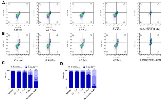 Induction of apoptosis in adapalene-treated AMO1 cells. (A,B) Apoptosis was examined in AMO1 cells treated with adapalene after 48 h (A) and 72 h (B) using annexin V/PI staining. Q4 represents viable cells (−) annexin V/(−) PI; Q3 represents early apoptotic cells (+) annexin V/(−) PI; Q2 represents late apoptotic cells exhibit annexin V (+)/PI (+); Q1 represents necrotic cells (−) annexin V/(+) PI. Treatment with adapalene at increasing concentrations greatly enhanced the percentage of early and late apoptotic cells after 48 and 72 h. (C,D) The bar diagrams showing the distribution of AMO1 cells in the different quadrants after 48 h (C) and 72 h (D) were created by calculating the mean value ± SD of three trials conducted at distinct times. * p < 0.05, ** p < 0.01, *** p < 0.001 if compared to negative control.