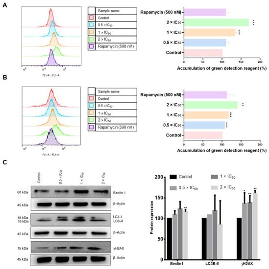 Induction of DNA damage and autophagy in adapalene-treated AMO1 cells. (A,B) Autophagy was examined in AMO1 cells treated with adapalene after 48 h (A) and 72 h (B) using green detection reagent. The histograms overlays were obtained by flow cytometry using an excitation and an emission wavelength of 463 and 534 nm, respectively. The bar diagrams were created by calculating the mean value ± SD of three trials conducted at distinct times. (C) Effect of adapalene (0.5 × IC50, 1 × IC50, and 2 × IC50) on the protein expression levels of γH2AX, Beclin 1, and LC3-II in AMO1 cells as detected by western blot. The bar diagram was created by calculating the mean value ± SD of three trials conducted at distinct times. * p < 0.05, ** p < 0.01, *** p < 0.001 if compared to negative control. The uncropped bolts are shown in Supplementary Materials Figures S3–S5.
