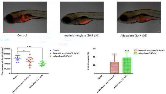 The anti-tumor efficacy of adapalene has been confirmed in vivo using murine models [20,22]. In this study, a CCRF-CEM xenograft tumor model was established in larvae zebrafish, and the fluorescence intensity was measured to calculate the tumor inhibition rate after 24 h treatment. Comparing the positive control imatinib mesylate with the untreated group revealed that imatinib mesylate significantly reduced the intensity of the fluorescent CCRF-CEM tumors (Figure 11). The same was true for adapalene, which reduced the growth of CCRF-CEM tumors with an inhibitory rate of 38.23% at 3.47 nM. Even though adapalene has been administrated at an extremely low dose, it nonetheless demonstrated a higher inhibitory rate than the positive control drug. Our investigations revealed that adapalene possessed anti-tumor properties in a larvae zebrafish model.