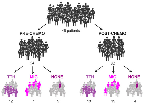Illustration of BC population, considering treatment and presence of headache. In total, 10 of 46 patients performed both pre- and post-chemo exam.