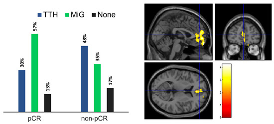 (left) Headache presence in patient subgroups according to response to NAC (right). Statistical map of the two-sample t-test performed between TTH and MiG subjects before chemotherapy treatment. Examining all of the voxels in the brain and testing each voxel individually at a p-threshold of 0.02, we controlled the cluster-level family-wise error rate.