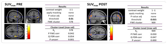 Prior to any statistical analysis, PET scans were spatially preprocessed with Statistical Parametric Mapping (software version 12—SPM12) [36] software, following a spatial normalization and smoothing procedure. The [18F]FDG PET images of the subjects were normalized with the template developed by Della Rosa and co-authors [37], and are available to download in the “Templates” section (on the SPM official website, https://www.fil.ion.ucl.ac.uk/spm/ext/#tpl accessed on 1 February 2022). Other estimation options for spatial normalization, including source image smoothing (8), affine regularization (ICBM space template), and nonlinear frequency cut-off (25), nonlinear iterations (16), and nonlinear regularization (1), were kept equal to the default batch variables of SPM12. Spatially normalized images of all subjects were subsequently smoothed with an isotropic 3D Gaussian kernel of 8 mm FWHM before entering the statistical analysis.