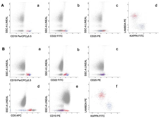 (A) Flow cytometry histograms of the PB in a patient with the phenotype usually described in WM. The figure shows the immunophenotypic profile of normal and abnormal B lymphocytes (colored in blue and red, respectively) regarding the expression of CD19 (a), CD22 (b), CD25 (c), and surface light chains (d). (B) Flow cytometry histograms of the PB in the CD19+dim/CD22+dim/CD25− WM with co-expression of CD5 and CD10. The figure shows the immunophenotypic profile of normal and abnormal B lymphocytes (colored in blue and red, respectively) regarding the expression of CD19 (a), CD22 (b), CD25 (c), CD5 (d), CD10 (e), and surface light chains (f).
