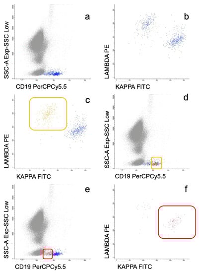 Flow cytometry histograms of the PB in a patient with monoclonal IgM kappa peak in which a small abnormal B cell population with normal kappa:lambda ratio (61% vs. 39%) was detected (a,b). When analyzing the population of B lymphocytes with uninvolved (non-clonal) light chain expression (CD19+lambda+, yellow frame), the intensity of CD19 expression was found to be higher than that observed in the remaining B lymphocytes (c,d). Only when the dimmer CD19+ B lymphocytes were analyzed (red frame), the kappa:lambda ratio was altered, displaying the presence of monotypic kappa+CD19+ neoplastic cells (82%) (e,f).