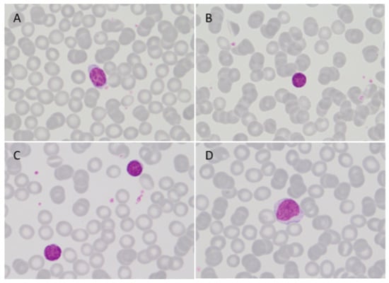 PB smear (MGG) in leukemic WM, 100×. Small lymphocytes with round nuclei, clumped chromatin, and scanty cytoplasm (A–C) or lymphocytes with moderately large, slightly basophilic cytoplasm and inconspicuous nucleolus (D) were observed.
