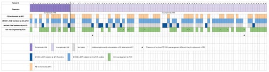 The heatmap shows the data from the WM patients of the series (N = 100). Each column represents a patient. On the top left of the heatmap, the patients with symptomatic WM are shown in dark violet, and, on the top right, the patients with asymptomatic WM are depicted in light violet. Each row represents (from top to bottom): PB involvement by MFC (positive cases are represented as orange cells and negative cases as white cells); MYD88 L265P mutation by AS-qPCR (positive cases are depicted in blue and negative cases in white); MYD88 L265P mutation by dPCR (positive cases are represented as dark blue cells and negative cases as white cells), and IGH rearrangement by PCR (positive cases are depicted in green and negative cases in white). The presence of additional abnormal circulating B cell populations is represented by a black star. The presence of a clonal PB IGH rearrangement different than that observed in BM is depicted with a black triangle. Grey cells indicate not tested.