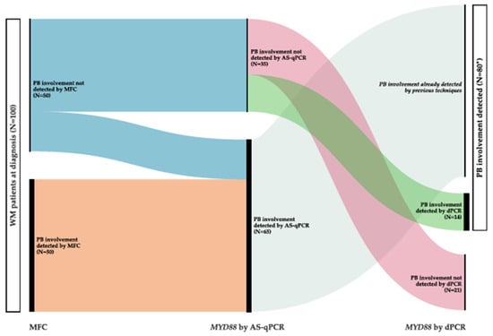 Alluvial diagram showing the cases with PB involvement by MFC (n = 50), all of them with MYD88mut by AS-qPCR (100%). In the cases with no evidence of leukemic involvement by MFC (n = 50): MYD88mut by AS-qPCR in 15/50 and MYD88wt by AS-qPCR in 35/50 patients. MYD88 L265P mutation by dPCR was performed in the latter group; in 14/35 patients, MYD88mut was detected by dPCR and not detected in 21/35 patients. * In one patient, PB involvement was detected by IGH rearrangement only.
