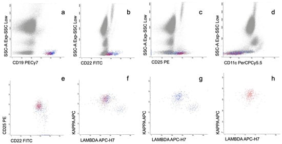Representative flow cytometry histograms of WM patients using the eight-color tube implemented in our laboratory daily routine for detection of abnormal circulating B cells in cases with IgM monoclonal peak. The figure shows the immunophenotypic profile of normal and abnormal B cells (colored in blue and red, respectively) regarding the expression of CD19 (a), CD22 (b), CD25 (c), CD11c (d), and surface light chains (f–h). The presence of a CD22+dim/CD25+ population is better identified in a CD22/CD25 biparametric histogram (e). Surface light chain expression in the whole B cell population, in normal B lymphocytes, and in circulating WM cells is depicted in f (85% kappa+, 15% lambda+), g (70% kappa+, 30% lambda+) and h plots (100% kappa+), respectively.