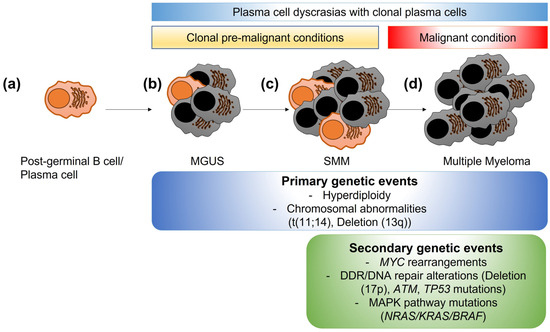 Clonal evolution of plasma cell dyscrasias. (a) A mature post-germinal B cell or plasma cell normally produces specific antibodies to aid in immune responses. (b) In some individuals, low levels of abnormal post-germinal B cells/plasma cells become clonally expanded (grey cells), producing a specific monoclonal-protein. This stage is called gammopathy of undetermined significance (MGUS) and is a premalignant condition. (c) Smoldering multiple myeloma (SMM) is the progression of MGUS, with higher numbers of abnormal clonal plasma cells. SMM is still a premalignant condition. (d) Multiple myeloma is the overt malignant condition, with higher percentages of abnormal clonal plasma cells leading to organ damage (anemia, kidney injury, bone lesions, or hypercalcemia). While some genetic changes are considered primary events also present in MGUS and SMM stages, secondary events, such as MYC rearrangements, alterations/mutations in DNA damage response or DNA repair genes, or mutations in the mitogen-activated protein kinase (MAPK) pathway genes are associated with progression to MM.