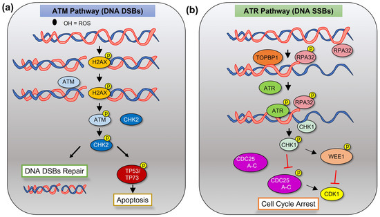 ATM- and ATR-mediated pathways in the presence of damaged DNA. (a) The ATM signaling pathway responds to DNA double-strand breaks (DSBs), which cause the inactive ATM to split into active ATM monomers to start a phosphorylation cascade. This event recruits other signaling proteins, such as CHK2 and TP53, to allow for DNA damage repair or apoptosis and senescence if the damage is too severe. (b) The ATR pathway is activated in times of replicative stress caused by DNA single-strand breaks (SSBs), lack of nucleotide bases, and stalls at the replication fork. The subsequent binding of replication protein A2 (RPA32) to the replication fork allows a phosphorylation cascade of ATR and CHK1 to happen, leading to cell cycle arrest by CDC25-mediated CDK1 activation to ensue DNA fidelity. p = phosphorylation.