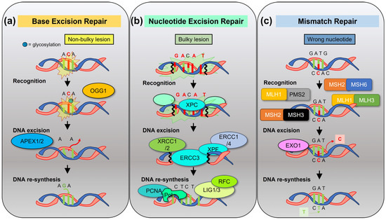 Excision repair pathways of DNA single-strand breaks. Three types of excision repair pathways exist to remove damaged single-strand DNA and re-synthesize a new DNA strand, using the undamaged complementary strand as a template. (a) Base excision repair (BER) is responsible for the removal of non-bulky DNA lesions due to oxidation, alkylation, or glycosylation. Damage is recognized by a DNA glycosylase, such as OGG1. The damaged portion is then resected by APEX1/2 enzymes to undergo new DNA synthesis. (b) Nucleotide excision repair (NER) occurs in the presence of bulky lesions to remove a string of nucleotides. After damaged DNA or helix distortion is recognized and verified by XPC, a transcription initiation and repair factor complex composed of ERCC1, ERCC3, ERCC4, and XRCC1 proteins is recruited, and new DNA is added by replication protein proliferating cell nuclear antigen (PCNA), replication factor C (RFC), DNA polymerases, and DNA ligase 1 or XRCC1–DNA ligase 3. (c) Mismatch repair is activated when an incorrect Watson–Crick base pairing (outside the typical A to T and G to C) occurs. Mutation recognition of errors is performed by heterodimers MSH2-MSH6 or MSH2-MSH3, followed by termination of mismatch-provoked excision by heterodimers MLH1-PMS2 or MLH1-MLH3, full excision by EXO1, and replacement with the correct base pairing.