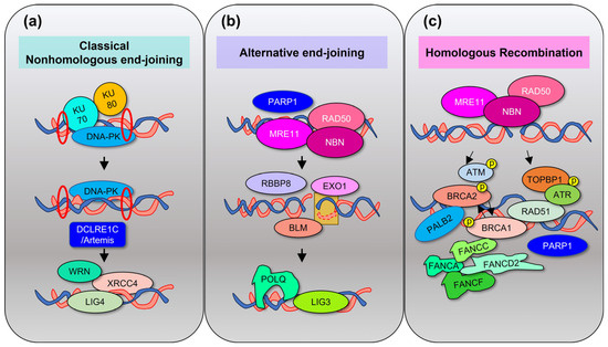 Regarding the pathways involved in repair of DNA DSBs, NHEJ is active throughout the whole cell cycle, while HR acts preferentially in the S and G2 phases of the cell cycle, leading to differing accuracy in repair of the original DNA sequence [24] (Figure 4). In the NHEJ pathway, DNA DSBs are recognized by DNA-dependent protein kinase (DNA-PK), a serine/threonine protein kinase, which forms a complex with Ku proteins (Ku70/80). This activates DNA cleavage via DNA cross-link repair 1C (DCLRE1C/Artemis), phosphorylation of Werner syndrome helicase (WRN), and then activation of X-ray repair cross-complementing 4 (XRCC4) and DNA Ligase IV (LIG4) to ensure DNA repair. In cases of loss of Ku proteins, the alt-EJ pathway is activated, leading to extensive resection of the DNA ends to reveal sequence homology, followed by annealing and ligation via a complex composed of DNA polymerase theta (POLQ), Pol poly(ADP-ribose) polymerase 1 (PARP1), RB binding protein 8, endonuclease (RBBP8), Ligase 3 (LIG3), and the MRN protein complex (MRE11 homolog, double-strand break repair nuclease-MRE11, RAD50 double-strand break repair protein-RAD50, and nibrin-NBN) [20].
