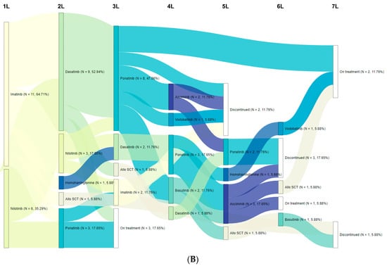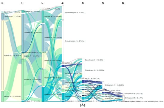 Sankey diagram of treatment patterns for CML-CP patients: (A) Patients with three or more lines of therapy. (B) Patients with the T315I mutation. Abbreviations: 1/2/3/4/5/6/7L, first/second/third/fourth/fifth/sixth/seventh line; Allo-SCT, allogeneic stem cell transplantation.