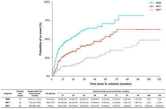 During 3L therapy, 54.8% of patients (n = 86) showed a complete cytogenetic response (CCyR; defined as an absence of Philadelphia chromosome-positive metaphases as measured by bone marrow cytogenetics). Of the patients with documented responses in 3L (N = 145), over half (54.5%) achieved MMR in 3L in a median time of 20.8 months; over one-third (40%) achieved MR4.0 in a median time of 57.6 months, and 24.8% achieved MR4.5 with median time to event not reached (Figure 2). The rate of MMR, MR4.0, and MR4.5 at 12 months was 42%, 26%, and 14%, respectively. Sustained MR4.0 (defined as achieving MR4.0 or better [i.e., BCR::ABL1 ≤ 0.01%] in all consecutive assessments performed for at least 12 months [i.e., 365.25 days]) was achieved by 33.1% of patients for a median duration of 87.1 months, and sustained MR4.5 (defined as achieving MR4.5 or better [i.e., BCR::ABL1 ≤ 0.0032%] in all consecutive assessments performed for at least 2 years [i.e., 730.5 days]) was achieved by 11.7% of patients for a median duration of 134.2 months. Treatment-free remission (TFR) was observed in 16 patients (10.2%) in 3L (median duration: 45.3 months). Among the 16 patients in TFR, five (31.3%) were intolerant to 3L TKI.