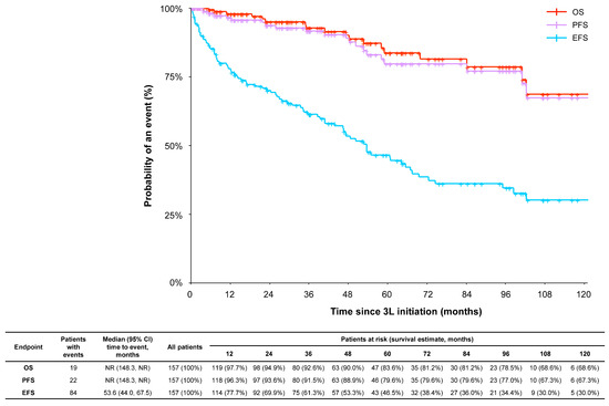 The survival outcomes of patients in the 3L+ cohort are shown in Figure 3. The overall median EFS was 53.6 months (95% CI: 44.0, 67.5 months). Overall median PFS and OS were not reached as of data collection for all patients in the 3L+ cohort; 19 patients (12.1%) had died as of data abstraction due to disease progression (n = 7 [36.8%]), toxicity (n = 1 [5.3%]), or other reasons (n = 10 [52.6%]) including bacterial infection, cardiac complications of renal failure, cardiac insufficiency, congestive heart failure, diabetes, general impairment, sepsis, stroke, and unclassified infection. The cause of death was unknown in one patient. In a subgroup analysis of patients in the 3L+ cohort with intermediate ELTS risk (vs. patients with high, low, and not assessed/unknown risk), the median OS (95% CI) was 102.4 (102.4, not reached) months.