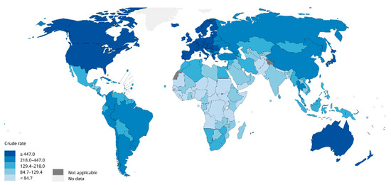 Worldwide estimated crude incidence rates of female breast cancer (2020) [2].