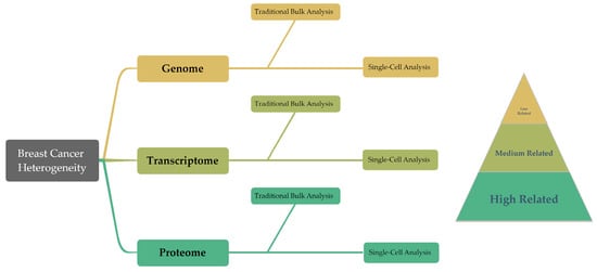 This diagram presents an overview of the structure of the article, summarizing the traditional bulk techniques and single-cell findings in genomics, transcriptomics, and proteomics. Moreover, these three groups demonstrate a progressive correlation with cancer cell behavior in the research on breast cancer heterogeneity.