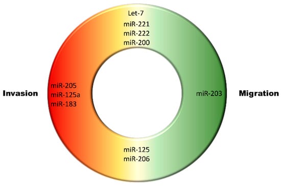 Continuous rings showing an overlapping role of several miRNAs in breast cancer migration and invasion [85].