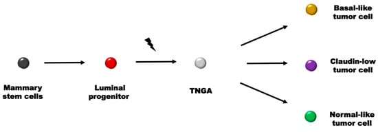 Building upon the insights gleaned from the aforementioned research, TNGA cells, characterized by their stemness properties, demonstrate shared traits with three distinct tumor subtypes: basal-like, claudin-low, and normal-like subtypes. Consistent with the CSC theory, TNGA cells are believed to occupy an intermediate state. This premise aligns with the established models proposed in previous studies [96]. In model 1, it was observed that most invasive breast tumors can be arranged along the differentiation hierarchy of normal breast ductal epithelium, starting from the claudin-low subtype closest to Mammary Stem Cells (MaSCs), followed by basal-like and HER2-enriched subtypes, and then the two luminal tumor subtypes, with the luminal subtypes closest to mature luminal cells [129]. In model 2, MaSCs give rise to claudin-low tumors, luminal progenitor cells give rise to basal-like tumors, and mature luminal cells give rise to luminal subtypes A and B tumor cells. The speculated origin cells of HER2-enriched tumors could be epithelial cells in a transitional differentiation state, straddling between luminal progenitor cells and mature luminal cells [96]. In model 3, transformed MaSCs, imbued with claudin-low/mesenchymal characteristics, retain capacity for both symmetric and asymmetric division, the latter of which facilitates cell differentiation and halts at certain differentiation stages. The majority of tumors will consist of luminal progenitor/basal-like cells or more differentiated luminal cells, with each molecular subtype having a subset of cells with a low expression of mesenchymal/tight junction proteins [130].