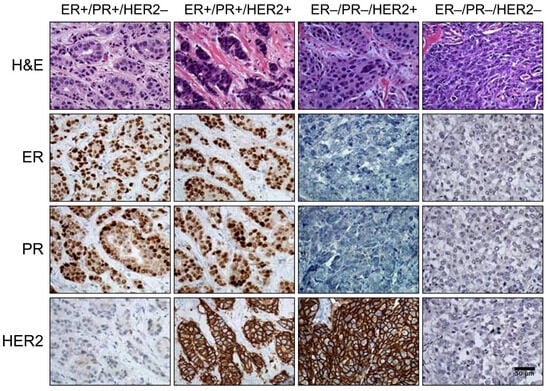 Significantly, markers identified through IHC are routinely utilized to discern the protein expression levels within tumor cells, thereby playing an integral part in traditional pathological examinations. The essence of IHC lies in the restoration of the three-dimensional structure of proteins, potentially disrupted during the processes of fixation and embedding, facilitated via heat or chemical treatment. This restoration enables antibodies to interact effectively with target proteins. To amplify specificity and sensitivity, certain proteins such as bovine serum albumin or serum are employed to inhibit non-specific antibody binding to non-target proteins in tissues. This step is succeeded by the application of a specific antibody to bind the protein of interest in cellular or tissue samples, eventually leading to a staining reaction through the interaction with a secondary antibody or enzyme [134]. Within the context of breast cancer diagnosis, standard evaluation involves classification according to the expression levels of key receptors such as estrogen receptor α (ER), progesterone receptor (PgR), and human epidermal growth factor receptor 2 (HER2). These categories comprise ER-positive, ER-negative/HER2-positive, and ER-negative/HER2-negative cases (primarily PgR-negative, also known as triple-negative breast cancer) (Figure 5).