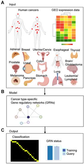 We utilized a computational biology platform [24], which uses random forest classification to evaluate the similarity of transcriptional profiles between in vivo cells and engineered or differentiated in vitro cells. Here, we used a similar strategy to construct a platform to identify cancer type-specific GRN for 17 types of human cancer (Figure 1A). Gene expression has been successfully used to reconstruct GRNs [32,33], and CellNet deploys an InfoMap community detection algorithm [34] to gain insight into subnetworks [25] and to assign subnetworks to specific cell and tissue types. GRNs regulate distinct expression programs of a given cell type and control cell type-specific response to extrinsic and intrinsic signals. GRNs control cell type identity by regulating distinct expression programs [35]. We used public gene expression data from 17 solid and liquid tumor types (Figure 1A; Tables S1 and S2) to train a random forest classifier (Figure 1B,C).
