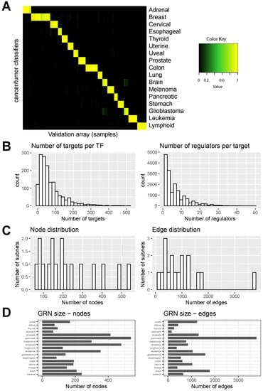 Validation of the CellNet model applied to pan-cancer expression data. (A) Heatmap showing the classification of a human pan-cancer validation dataset. Classifiers were created for each cancer and tumor type. Rows show cancer/tumor classifiers; columns show validation arrays (samples). High classification scores suggest a high probability of query samples expressing GRN genes at a level similar to the training data’s cancer/tumor type. (B) The number of targets per transcription factor (TF) and the number of regulators per target. (C) The node distribution and edge distribution (number of nodes and edges). (D) GRN size. Number of nodes and edges for each cancer/tumor type is shown in the barplot.