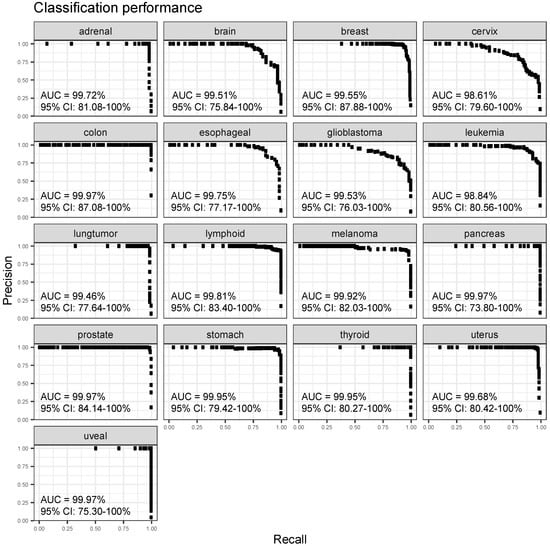 The classifier performance was assessed using precision sensitivity curves for each gene expression cancer type classifier as previously described [24,25] (Figure 3). The mean AUC surpassed 98% for all 17 cancer types, with all 95% confidence intervals ranging from 73% to 100%.