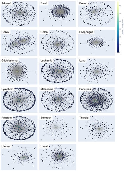 Here, we utilized the core engine of a network biology platform [24] to identify cancer type-specific GRNs for 17 types of cancers (adrenal, breast, cervical, esophageal, colon, lung, brain/glioma, leukemia, lymphoid, melanoma, pancreatic, prostate, stomach/gastric, thyroid, uterine, and uveal). The choice of these specific types was driven by the availability of gene expression data from tumor samples in public databases. Given the requirement for a sufficient volume of sample data to conduct a reliable analysis, we grouped all subtypes of each cancer together. This aggregation approach increases the pool of available data, thereby enhancing the statistical power and reliability of the analysis. However, it is important to recognize that this method may mask some subtype-specific characteristics.