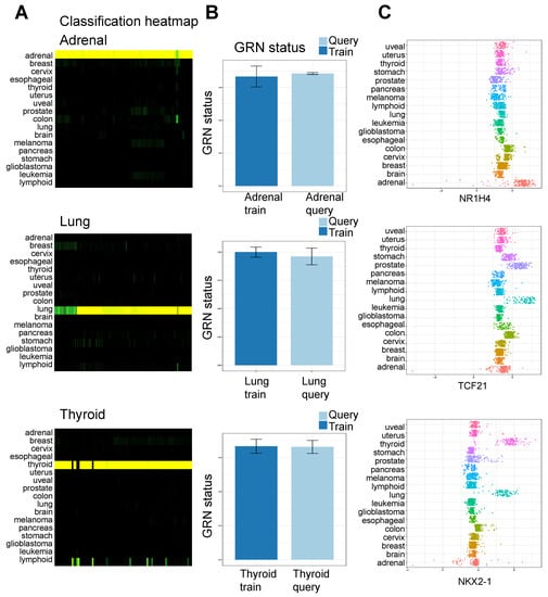 Analysis of pan-cancer expression data. (A) Classification heatmap of the normal query data relative to trained cancer data. Rows indicate cancer/tumor type of the training data, and columns are normal query samples. Each square is colored according to the classification score of the query sample for a particular cancer/tumor type (score: 0 to 1). The yellow color in the classification heatmaps indicates the predicted assignment of a sample to a specific cell type based on its gene expression profile. The shade of yellow corresponds to the degree of confidence in the assignment, with brighter shades of yellow indicating higher confidence in the classification. The yellow color in the heatmap is used to visualize the predicted cell type assignments for each. (B) Cancer/tumor type GRN status of normal adrenal, lung, and thyroid tissue relative to cancer/tumor samples. GRN status shows the degree to which cell/tissue GRN is established in the training (dark blue) and query (light blue) samples. The GRN status is calculated as the average z-score of all genes in a cell/tissue GRN, weighted by their significance to the related cell/tissue classifier. The GRN status is standardized to the average GRN status of the training data samples for the particular cell/tissue type [24,25]. Error bars represent mean ± 1 s.d. (C) Expression of cancer/tumor-specific genes. Scatter plots show the expression of adrenal, lung, and thyroid-specific genes across the pan-cancer expression datasets. Each point depicts the expression of a gene in an individual training dataset. Cancer/tumor types are represented by different colors. X-axis: expression level; y-axis: cancer/tumor type.
