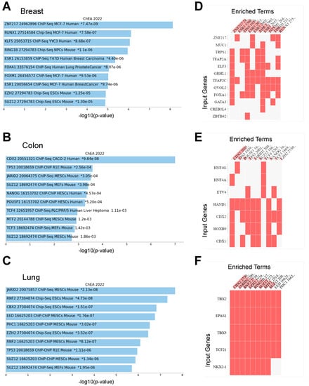 Target gene transcription factor associations of cancer/tumor type-specific genes. Enrichr ChEA target gene TF associations of cancer/tumor specific genes identified by querying normal cell/tissue expression data to trained cancer/tumor expression data. Results from Enrichr ChEA analysis for breast, colon, and lung cancer/tumor-specific genes: (A–C) Bar plots showing the top 10 enriched terms from the ChEA_2022 gene set library. Plots are ordered by −log10 (p-value) to display enrichment significance, with the actual p-value provided alongside. The top-most term signifies the highest overlap with the queried gene set. The number next to the asterix indicates the −log10 (p-value). (D–F) Clustergrams depict enriched terms as columns (transcription factor binding targets obtained from public ChIP-Seq datasets) and input genes as rows (cancer type-specific genes identified in this study). The intersection points in the matrix denote an association between a particular gene and a term.