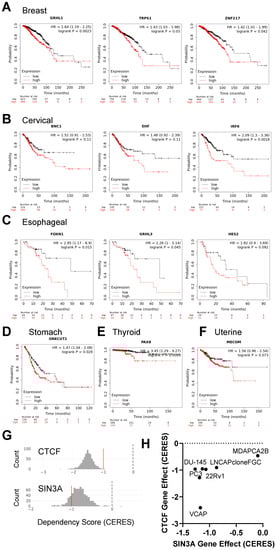 Association between expression of cancer-specific genes and survival. Kaplan–Meier curves for the overall survival of cancer patients exhibiting high (red) or low (black) expression of cancer/tumor specific genes in (A) breast, (B) cervical, (C) esophogeal, (D) stomach, (E) thyroid, and (F) uterine cancer. Patients are split by low and high expression (see methods for Kaplan–Meier plots). (G,H) Cancer dependency scores (gene effect, CERES) for CTCF and SIN3A in prostate cancer cell lines. (G) Histogram plot distribution of dependency scores across all cancer cell lines evaluated in the CRISPR screen [31]. A low negative dependency score indicates a higher likelihood that a gene is essential for the cell’s survival. A depmap score of less than −1 is highly essential to a cell. (H) Scatter plot distribution of CERES scores. Essential genes have a negative CERES score.