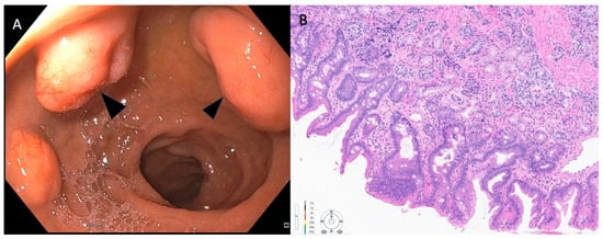 (A) Endoscopic appearance of sessile polyps noted in the duodenal bulb that were suspicious for duodenal NET (Arrow heads). They were both about 2.2 cm in maximal diameter. (B) Pathology from endoscopic bite-on-bite biopsies was consistent with well-differentiated neuroendocrine tumor. Patient underwent surgical resection using robotic sleeve duodenectomy. Pathology of surgical specimen confirmed grade-1, well-differentiated neuroendocrine tumor.