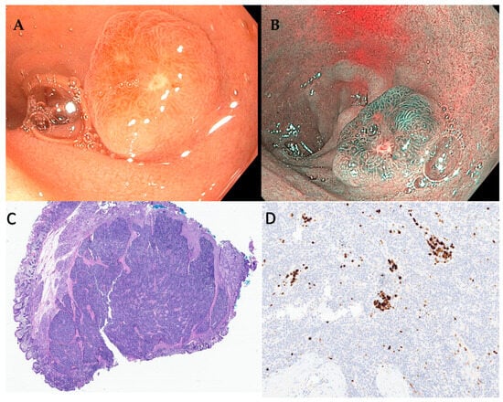 Similar to g-NENs, d-NENs also arise from the deep mucosal or submucosal layers and endoscopically appear as subepithelial lesions that are hemispherical or flatly elevated with reddish or yellowish hue on high-definition white light endoscopy (Figure 2 and Figure 3) [43].