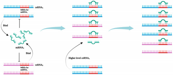 Competing endogenous (ceRNA) network mechanism. ceRNA1 and ceRNA2 possess the same miRNA-responsive elements (MREs), thus allowing them to bind miRNA1 competitively. The increased expression of ceRNA1 levels allows for a competitive binding with a high number of miRNA1 molecules. This leads to a reduction in the ceRNA2 that is inhibited by miRNA1, resulting in increased expression of ceRNA2.