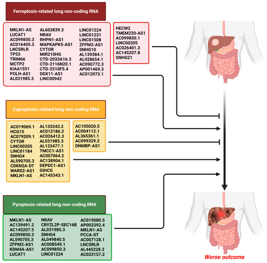 Recent progress shows that ncRNAs play a vital role in the dysregulation, initiation, and progression of HCC. This involves many aspects of HCC, such as tumor microenvironment, epithelial–mesenchymal transition, tumor invasiveness, and tumor metabolism [10,11]. It is noteworthy to highlight that ncRNAs have been extensively associated with the intricate control of programmed cell death (PCD) in HCC. These regulatory processes encompass multiple forms of cell death, such as autophagy, ferroptosis, and other related pathways. These pathways play a crucial role in determining the ultimate cell fate. The dysregulation of PCD has been shown to have a significant impact on treatment outcomes and prognosis in patients [12,13]. Hence, it is of paramount importance to understand the clinical implications associated with the regulation of ncRNA in PCD within HCC.
