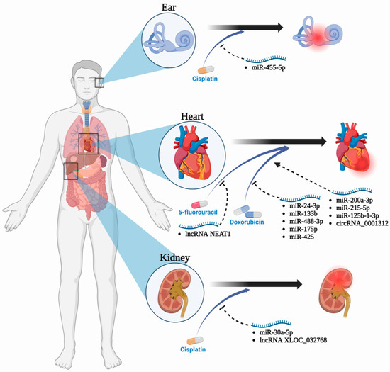 Cisplatin, a widely employed platinum-based antineoplastic agent, has therapeutic effects by impeding DNA synthesis through direct covalent interaction with DNA molecules [148]. In managing advanced HCC, the utilization of cisplatin in conjunction with other pharmacological agents has yielded a notable objective response rate of 36% [149]. However, the side effects of cisplatin on normal tissues and organs, particularly kidney tissue damage characterized by tubular cell necrosis and apoptosis, limit its clinical use [150]. To address this matter, recent investigations have directed their attention toward exploring the potential of ncRNAs in modulating the adverse effects associated with cisplatin therapy. Among them, a lncRNA called XLOC_032768 reduces the expression of tumor necrosis factor-alpha (TNF-α) induced by cisplatin in renal tubular epithelial cells through a transport mechanism. Research indicates that inhibiting the expression of TNF-α can improve cisplatin-induced apoptosis of renal tubular epithelial cells and kidney structural damage [151]. Additionally, in a study investigating the protective effects of extracellular vesicles in premature infant urine against cisplatin-induced acute kidney injury, researchers found that miR-30a-5p, the most abundant miRNA in premature infant urine-derived extracellular vesicles, can target and downregulate mitogen-activated protein kinase 8 (MAPK8) to protect HK-2 cells from cisplatin-induced apoptosis [152]. Besides nephrotoxicity, the regulation of ncRNAs can also alleviate cisplatin-induced ototoxicity. Studies have shown that resveratrol can upregulate the expression of miR-455-5p, thereby reducing PTEN levels and activating the PI3K/AKT pathway. This increases the survival rate of cisplatin-induced HEI-OC1 cells and reduces apoptosis and oxidative stress [153].