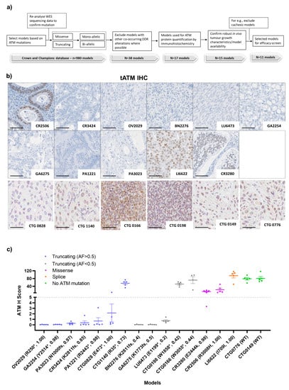 PDX model selection and the baseline profile of ATM protein expression and genetic alterations. (a) Strategy for the selection of PDX models, (b) representative IHC images of tATM in 17 PDX (scale bar represents 50 µm), and (c) comparison between the ATM H score and different type of ATM alterations across 17 PDX models. Letters and numbers in brackets on the x-axis denote the ATM protein change and variant allele frequency, respectively. * Indicates the predicted truncating ATM mutation and fs indicates a frameshift mutation. Data represented as the mean ± SEM (n = 4 or 5 per model). Images were captured at 40× magnification. For detailed IHC staining, refer to the method section.