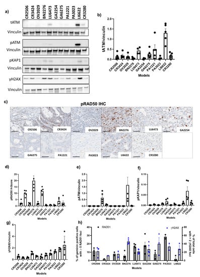 Baseline expression of downstream markers of ATM and RAD51 foci scores in PDX models. (a) Representative Western blot analysis for tATM, pATM, pKAP1, and γH2AX expression in 11 PDX models. The uncropped blots are shown in File S1. (b) represents the average expression of tATM normalised to vinculin by Western blot analysis, (c) representative IHC images of pRAD50 IHC in 11 PDX models (scale bar represents 50 µm), (d) represents the mean H score of pRAD50, (e–g) represents the average expression of pATM, pKAP1, and γH2AX normalised to vinculin, respectively, and (h) represents the baseline RAD51 foci score and γH2AX staining by immunofluorescence (IF) across 9 models. Data are represented as the mean ± SEM with n = 5 for CR2506, CR3424, BN2276, GA6275, PA1221m and PA3023, n = 4, for OV2029, LU6473, and GA2254 for Western blot analysis. For RAD51 and γH2AX IHC quantification, samples that presented a low RAD51 score (<5 foci per cell) and low γH2AX score (<10% of total cells with ≥2 foci) were considered not evaluable due to the low levels of DNA damage. For detailed Western blot analysis and IF, refer to the methods section.